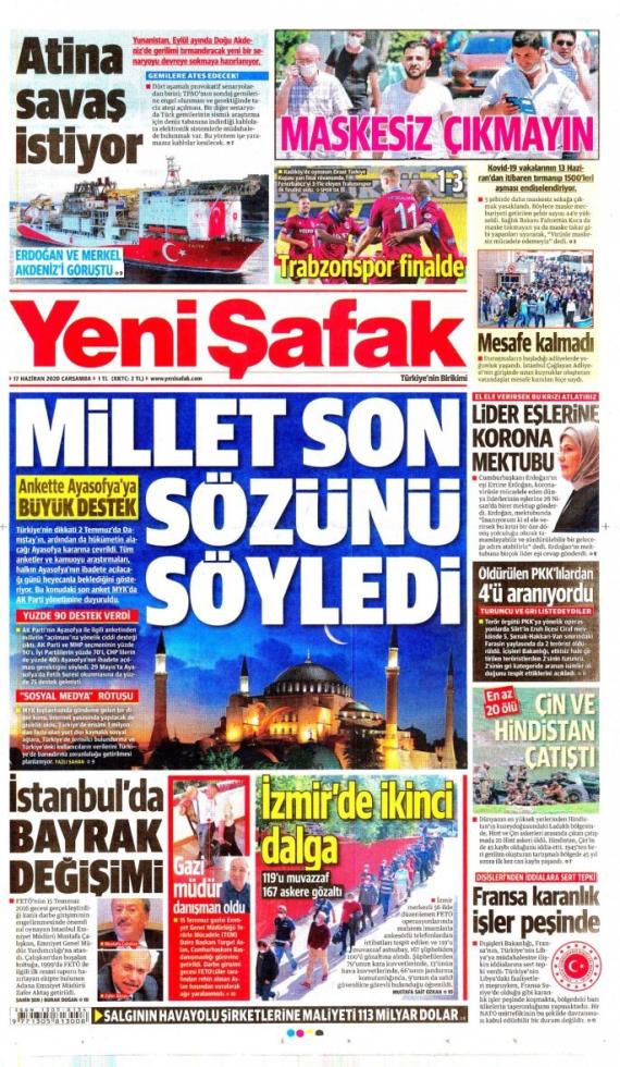 H τουρκική εφημερίδα χαρακτηρίζει το ελληνικό στρατιωτικό σενάριο ως «προβοκατόρικο». Το βασικό θέμα της Γενί Σαφάκ σήμερα είναι για άλλη μια φορά η Αγία Σοφία, με τίτλο «Το έθνος είπε την τελευταία του λέξη». Αναφέρεται στη χθεσινή δημοσκόπηση της AR-GE που δείχνει ότι το 90% των ψηφοφόρων του κυβερνώντος κόμματος και των εθνικιστών επιζητούν τη μετατροπή της Αγίας Σοφίας σε τζαμί.