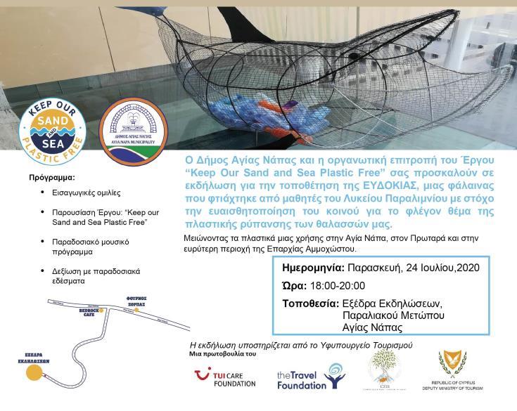 Σε γραπτή ανακοίνωση του Δήμου Αγίας Νάπας αναφέρεται ότι «μετά την πανδημία του κορωνοϊού, επαναρχίζει η εκστρατεία “Keep Our Sand and Sea Plastic Free”, με την τοποθέτηση ενός γλυπτού φάλαινας που κατασκευάστηκε από τους μαθητές του Λυκείου Παραλιμνίου και στοχεύει στην ευαισθητοποίηση του κοινού και την ενθάρρυνση της ανακύκλωσης. Το γλυπτό με το όνομα «Ευδοκία» έχει πρακτικό σκοπό αφού θα είναι σημείο ανακύκλωσης των πλαστικών συσκευασιών».