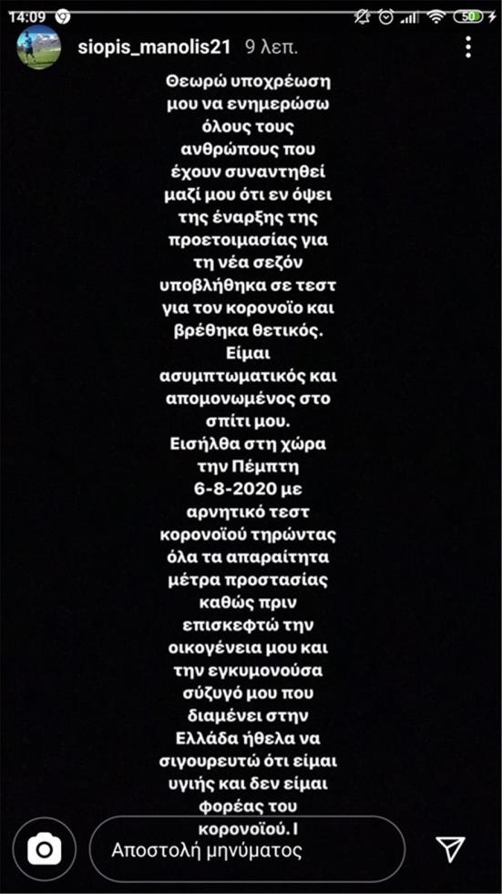 Στο μήνυμα του, ο Μανώλης Σιώπης σημείωσε: «Θεωρώ υποχρέωση μου να ενημερώσω όλους τους ανθρώπους που έχουν συναντηθεί μαζί μου, ότι ενόψει της έναρξης της προετοιμασίας για τη νέα σεζόν, υποβλήθηκα σε τεστ για τον κορωνοϊό και βρέθηκα θετικός. Είμαι ασυμπτωματικός και απομονωμένος στο σπίτι μου. Εισήλθα στη χώρα την Πέμπτη 6 Αυγούστου 2020 με αρνητικό τεστ κορονοϊού, τηρώντας όλα τα απαραίτητα μέτρα προστασίας καθώς πριν επισκεφτώ την οικογένεια μου και την εγκυμονούσα σύζυγο μου που διαμένει στην Ελλάδα, ήθελα να σιγουρευτώ ότι είμαι υγιής και δεν είμαι φορέας του κορονοϊού».