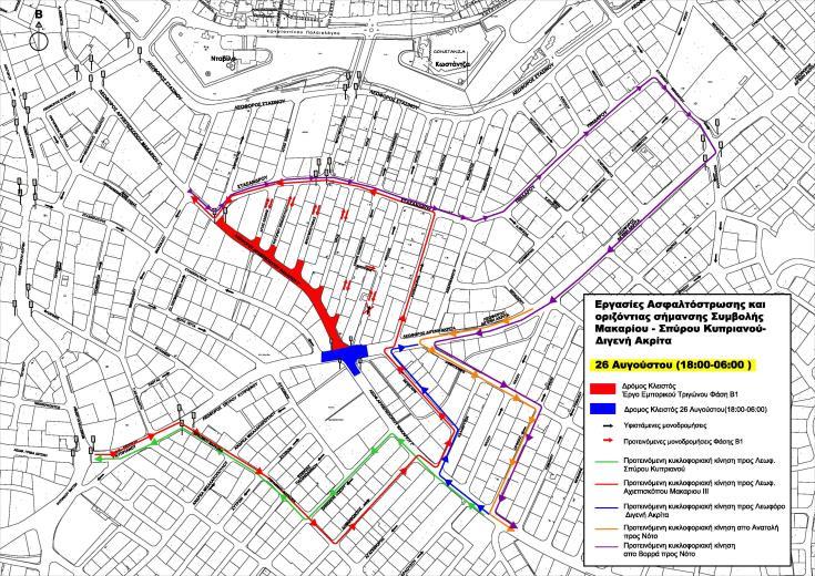 Στην ανακοίνωση προστίθεται ότι όλες οι κινήσεις από Σπύρου Κυπριανού και Διγενή Ακρίτα και αντίστροφα, οι κινήσεις από Μακαρίου προς Σπύρου Κυπριανού, Διγενή Ακρίτα και Κρήτης καθώς και η διακίνηση από Διγενή Ακρίτα προς την οδό Κρήτης δεν θα μπορούν να πραγματοποιηθούν.