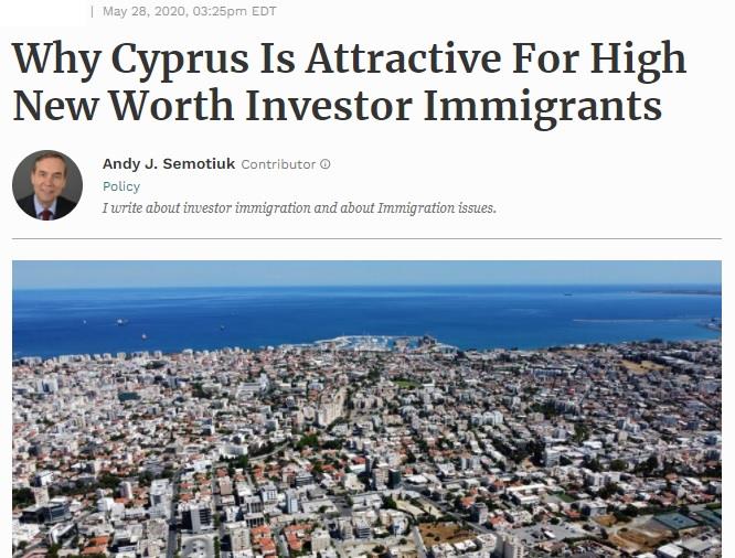 Τους λόγους για τους οποίους η Κύπρος συνιστά έναν από τους κορυφαίους προορισμούς για ξένους, εκατομμυριούχους επενδυτές, οι οποίοι στην σύγχρονη εποχή αναζητούν την εξασφάλιση ενός δεύτερου διαβατηρίου, εξηγεί σε άρθρο του που δημοσιεύθηκε στο Forbes τον προηγούμενο Μάιο ο Αμερικανοκαναδός δικηγόρος Andy J. Semotiuk.