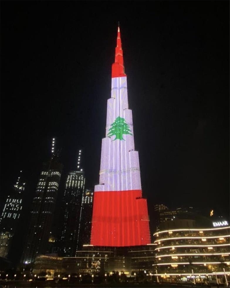 Στην πόλη Ντουμπάι, στα Ηνωμένα Αραβικά Εμιράτα, το υψηλότερο κτήριο στον κόσμο, με ύψος 827 μέτρα και 160 ορόφους φωταγωγήθηκε απόψε στα χρώματα της σημαίας του Λιβάνου ως ένδειξη συμπαράστασης στα δεκάδες θύματα της πρωτοφανούς τραγωδίας.