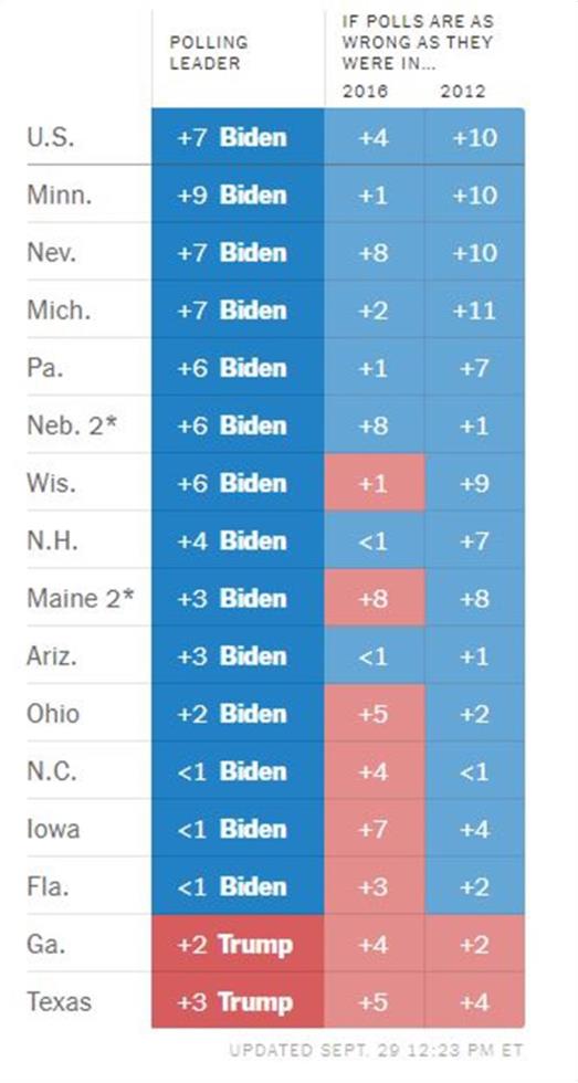 Τρίτον, στις δημοσκοπήσεις του 2016, εξετάστηκε το πιθανό στατιστικό σφάλμα κατά τις τελευταίες τρεις εβδομάδες. Αυτές οι δημοσκοπήσεις έδιναν νικήτρια την Κλίντον. Αυτή τη φορά, η ταλάντευση στις δημοσκοπήσεις είναι πολύ μικρότερες, σε σχέση με το 2016.