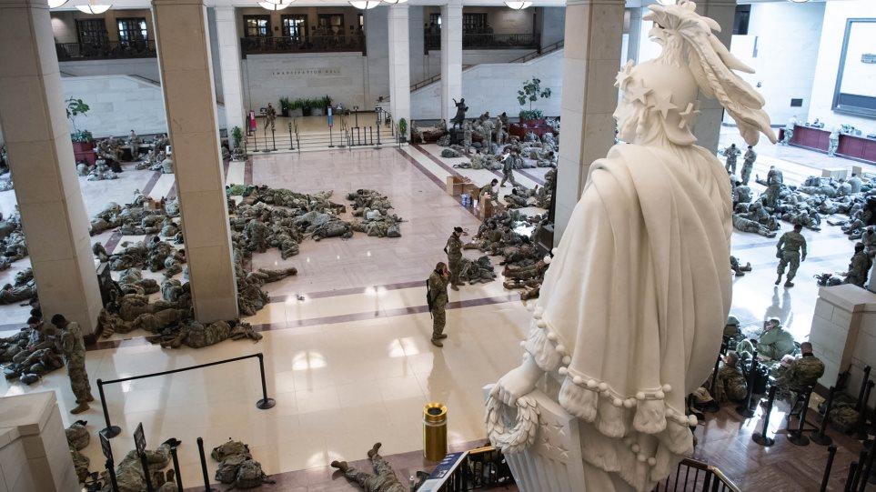 Εν μέσω όλων αυτών, έγινε γνωστό ότι ένας από τους πρωταγωνιστές των επεισοδίων στο Καπιτώλιο αυτοκτόνησε. Πρόκειται για τον 53χρονο τραπεζικό υπάλληλο Κρίστοφερ Στάντον Τζόρτζια. Την ίδια στιγμή, τον γύρο του κόσμου έκαναν εικόνες από το εσωτερικό του Καπιτωλίου. Ισχυρές δυνάμεις της Εθνοφρουράς έχουν “καταλάβει” το εσωτερικό του κτιρίου. Στρατιώτες έχουν κατακλύσει τους διαδρόμους του κτιρίου. Δεκάδες κοιμούνται και ξεκουράζονται στο πάτωμα.