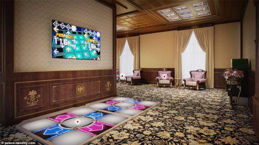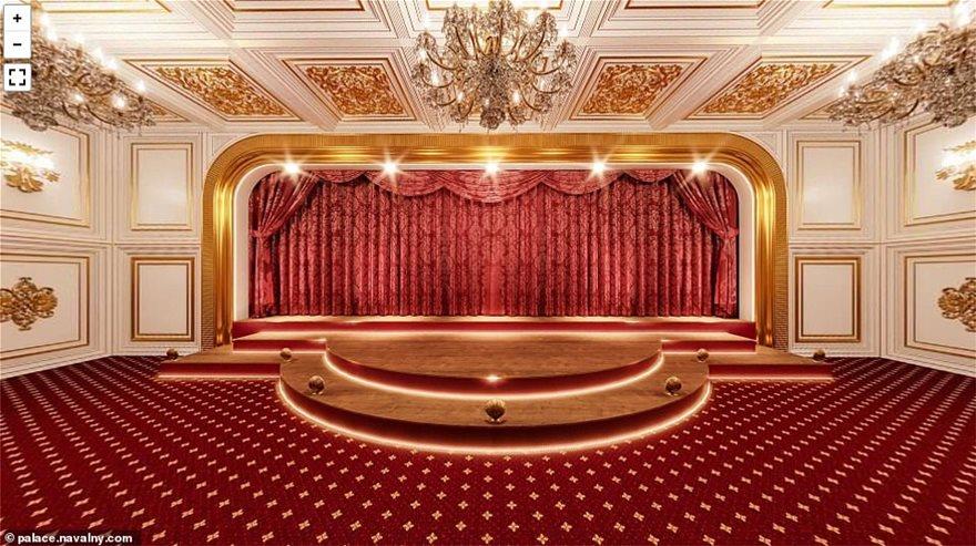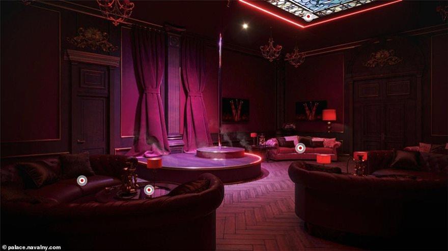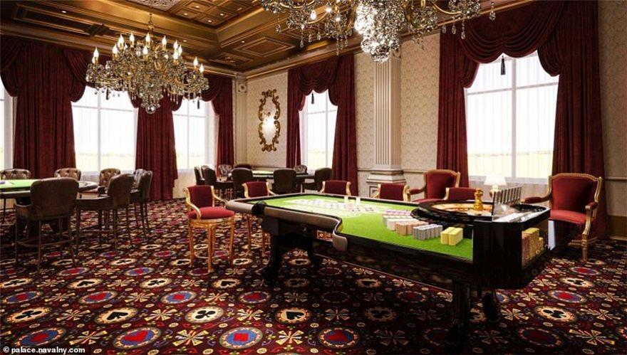 Οι αποκαλυπτικές εικόνες, που δημοσιεύτηκαν στο blog του Νοβόλνι, αποκαλύπτουν ένα παλάτι μοναδικής χλιδής που περιλαμβάνει μεταξύ άλλων ένα κανονικό θέατρο 500 θέσεων, ένα υπόγειο παγοδρόμιο, μια εκκλησία, ένα καζίνο με slot machines, τραπέζια για πόκερ και ρουλέτα, στριπτιζάδικο με μπάρες για pole dancing μεταξύ άλλων πολλών.