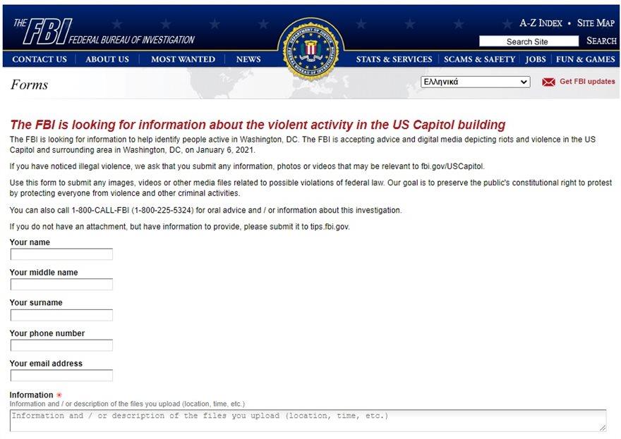 Σε αυτό το πλαίσιο, η ομοσπονδιακή υπηρεσία ερευνών των ΗΠΑ ζήτησε από όποιον έχει στη διάθεσή του κάποια στοιχεία ή ψηφιακά μέσα που απεικονίζουν σκηνές ταραχών και βίας στο Καπιτώλιο να εισέλθουν σε μια ειδική σελίδα που έχει δημιουργήσει και να συμπληρώσουν τη σχετική φόρμα.