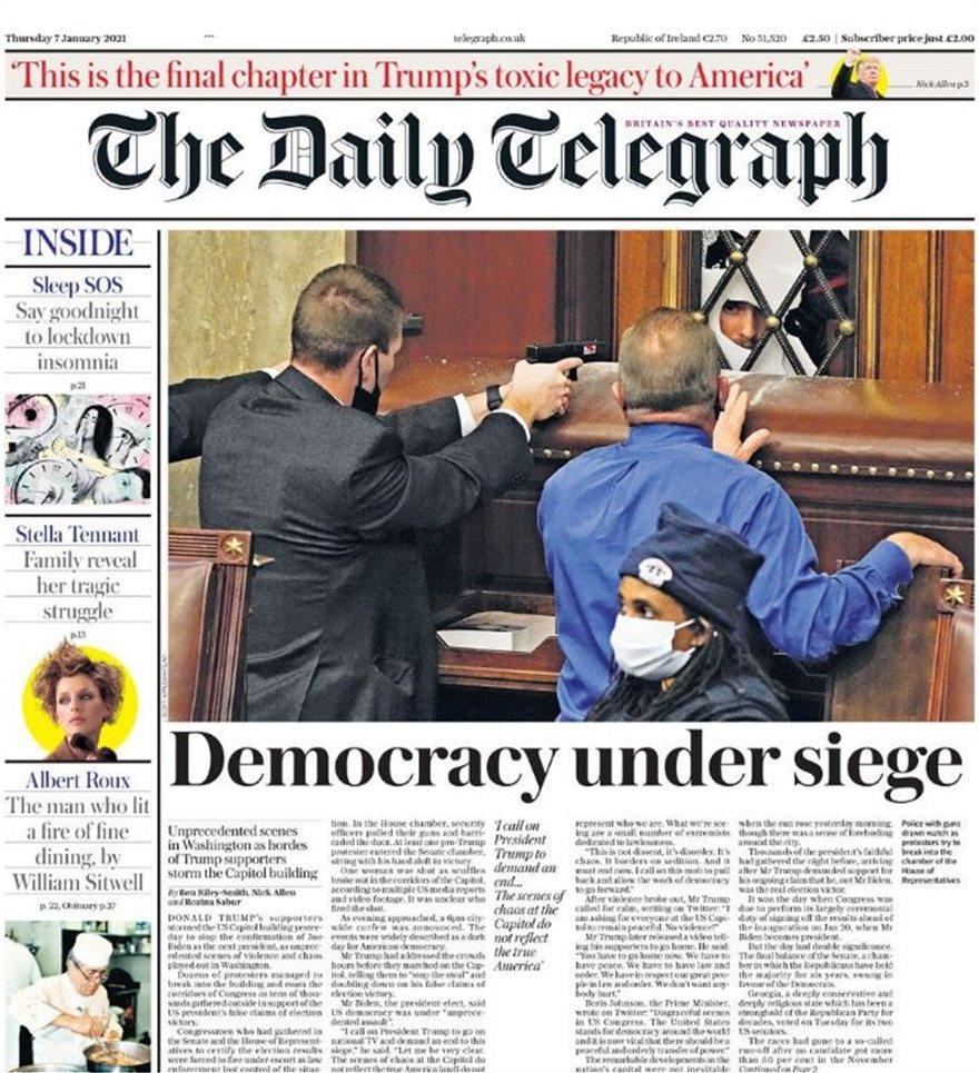 Κάτω από τον τίτλο «Η δημοκρατία υπό πολιορκία», η Daily Telegraph κάνει λόγο για «σκηνές χωρίς προηγούμενο στην Ουάσινγκτον» με «ορδές υποστηρικτών του Τραμπ» να καταλαμβάνουν τον ναό της αμερικανικής διπλωματίας.