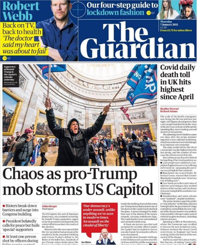 «Το Καπιτώλιο πολιορκημένο - Οι υποστηρικτές του Τραμπ καταλαμβάνουν την καρδιά της αμερικανικής δημοκρατίας», είναι ο τίτλος των Times του Λονδίνου, οι οποίοι περιγράφουν πώς οι δημοκρατικοί και ρεπουμπλικάνοι βουλευτές, που συνεδρίαζαν για να επικυρώσουν την εκλογή του δημοκρατικού Τζο Μπάιντεν, «φόρεσαν αντιασφυξιογόνες μάσκες και βρήκαν καταφύγιο κάτω από τα γραφεία» ενώ το προσωπικό «κρυβόταν μέσα στα γραφεία».