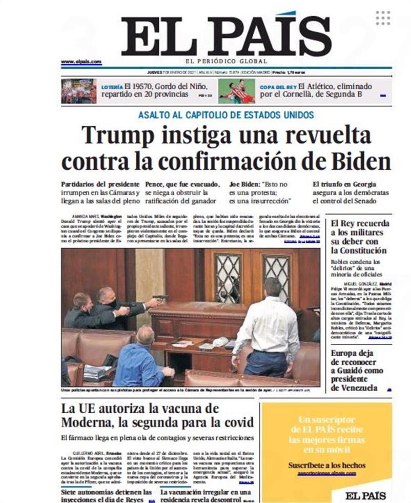 Για τη μεγάλη ισπανική εφημερίδα El Pais, «ο Ντόναλντ Τραμπ ενθάρρυνε χθες το χάος που δημιουργήθηκε στην Ουάσινγκτον την ώρα που το Κογκρέσο ετοιμαζόταν να επικυρώσει τον Τζο Μπάιντεν ως τον επόμενο πρόεδρο των Ηνωμένων Πολιτειών».