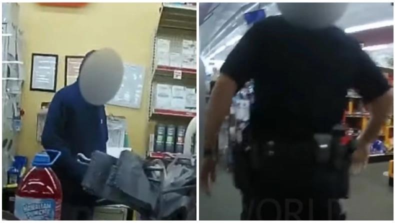 Στο πρώτο βίντεο φαίνεται αυτός ο αστυνομικός να εισέρχεται στο κατάστημα, να τραβά το όπλο του και στη συνέχεια να ζητά από τον Γκόρντον να βγάλει τα χέρια του από τις τσέπες. Ο αστυνομικός τον πλησιάζει και επιμένει. Ο Γκόρντον αρχίζει να τρέχει στους διαδρόμους του σούπερ μάρκετ και ο αστυνομικός τον ακολουθεί. Όταν τον πιάνει η εικόνα από το βίντεο δεν είναι πια καλή διότι ο αστυνομικός κουνιέται πολύ, όμως ακούγονται πολλοί πυροβολισμοί σε κοντινή απόσταση.