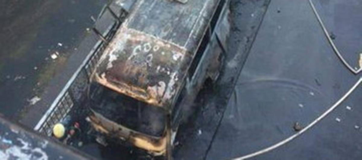 Φωτογραφίες στο λογαριασμό του τηλεοπτικού δικτύου στο Telegram εικονίζουν το απανθρακωμένο λεωφορείο.