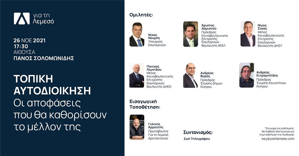 Ανοιχτή συζήτηση σχετικά με τη μεταρρύθμιση της Τοπικής Αυτοδιοίκησης διοργανώνει η «Πρωτοβουλία για τη Λεμεσό», την Παρασκευή 26 Νοεμβρίου 2021 (17:30) στο Δημοτικό Πολιτιστικό Κέντρο Πάνος Σολομωνίδης.