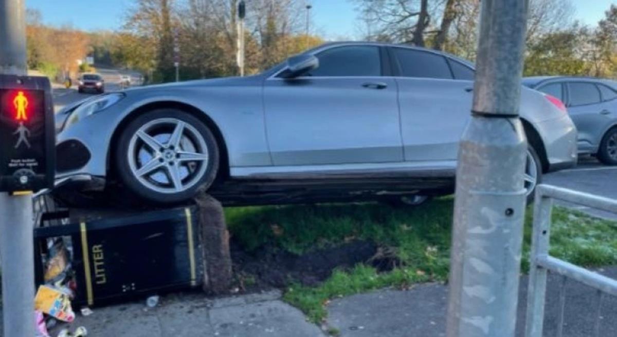 Οι δύο μπροστινές ώρες καβάλησαν τον κάδο με αποτέλεσμα η ολοκαίνουργια Mercedes του, αξίας 25.000 λιρών να αιωρείται από το έδαφος και να προκαλέσει αρκετά κοροϊδευτικά σχόλια στο διαδίκτυο.