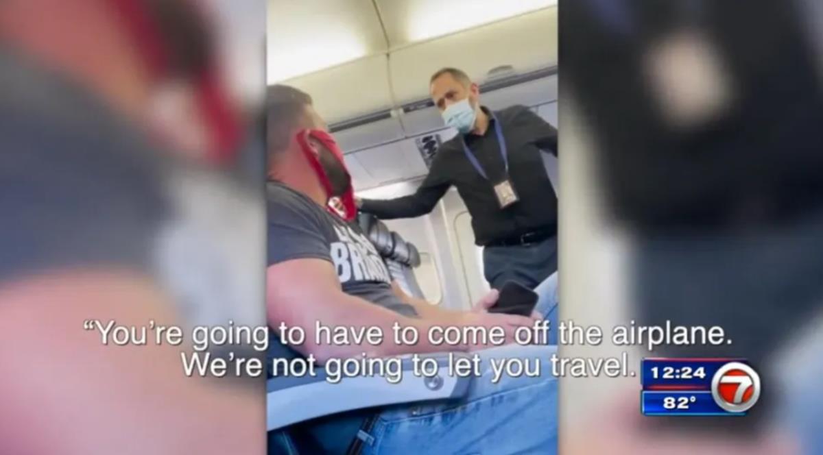 Ένα βίντεο που τράβηξε άλλος επιβάτης δείχνει το πλήρωμα να ενημερώνει τον 38χρονο ότι δεν μπορεί να παραμείνει εντός του αεροσκάφους εάν επιμένει να φοράει στο πρόσωπο το στρινγκ. Έπειτα από συζήτηση, ο άνδρας υποχωρεί και σηκώνεται από το κάθισμά του.
