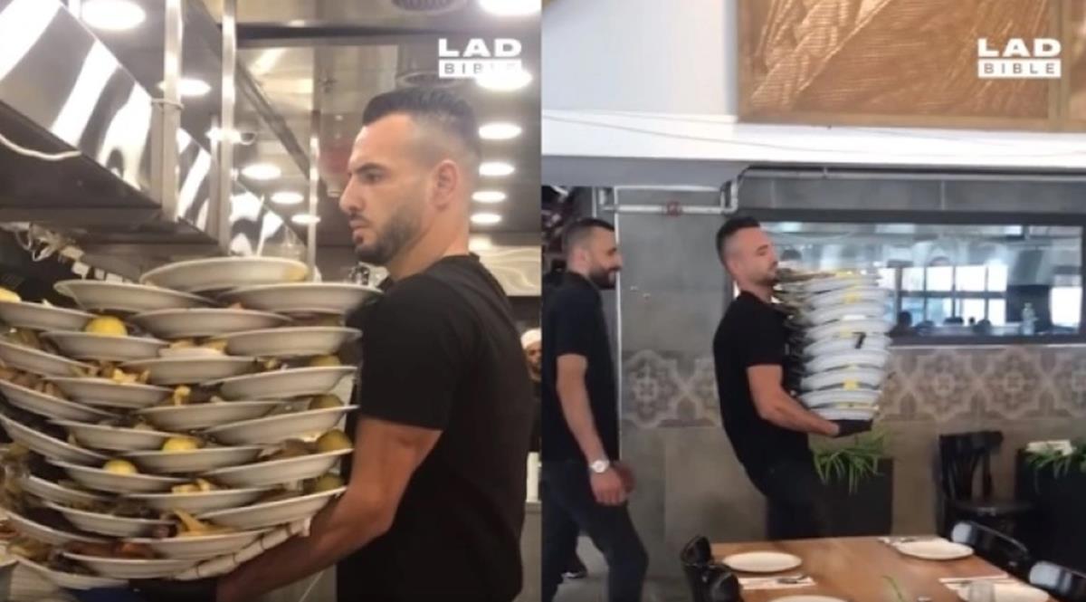 Ο νεαρός σερβιτόρος, κατέχει ίσως το ρεκόρ (κάτι ανάλογο δεν έχουμε ξαναδεί ή τουλάχιστον δεν έχει καταγραφεί) στο κουβάλημα πιάτων με φαγητό, καθώς μεταφέρει… 33 πιάτα παρακαλώ.