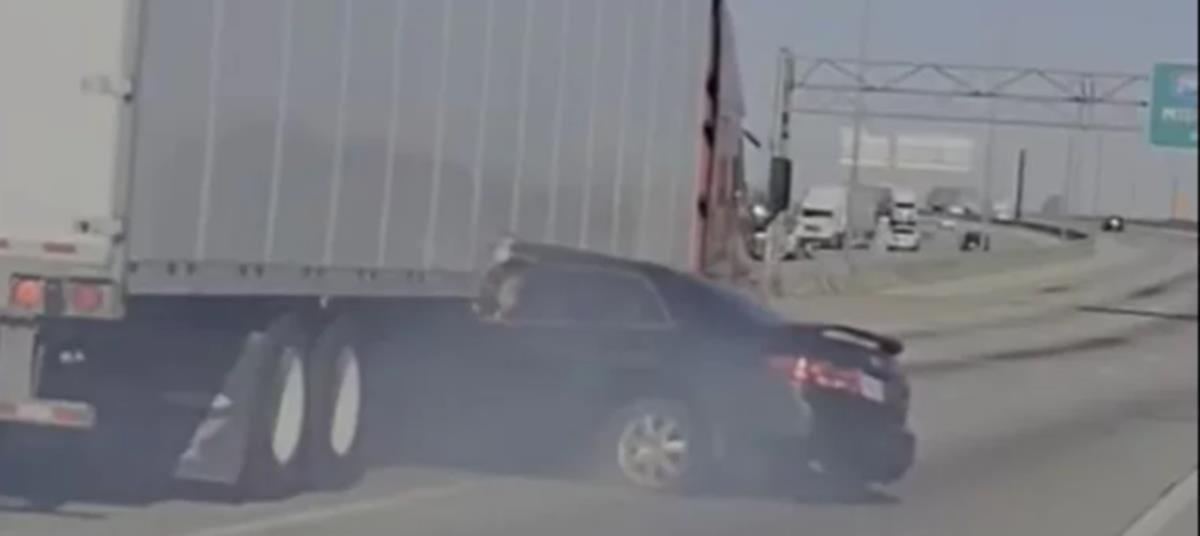 Στο βίντεο, η οδηγός του αυτοκινήτου μάλιστα, φαίνεται ξεκάθαρα να κουνάει τα χέρια της σε μια προσπάθεια να τραβήξει την προσοχή των άλλων οδηγών προκειμένου να ειδοποιήσουν τον οδηγό του φορτηγού. Η αστυνομία της πολιτείας του Ιλινόις είπε αργότερα πως το μαύρο Honda προσπαθούσε να αλλάξει λωρίδα όταν κόλλησε κάτω από το φορτηγό.