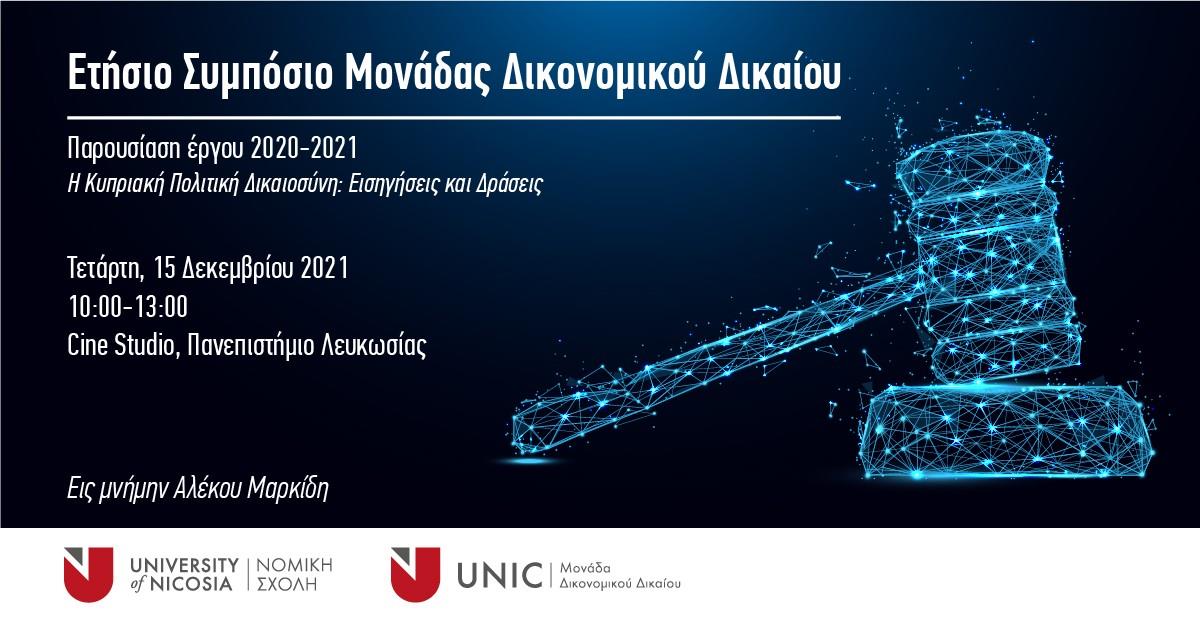 Ορισμένα από τα σημαντικότερα θέματα που απασχολούν τον χώρο της δικαιοσύνης στην Κύπρο θα τεθούν επί τάπητος στο προσεχές Συμπόσιο της Μονάδας Δικονομικού Δικαίου της Νομικής Σχολής του Πανεπιστημίου Λευκωσίας, «Η Κυπριακή Πολιτική Δικαιοσύνη: Εισηγήσεις και Δράσεις». Το Συμπόσιο θα διεξαχθεί στις 15 Δεκεμβρίου 2021, μεταξύ των ωρών 10:00 και 13:00 στο Cine Studio του Πανεπιστημίου Λευκωσίας και θα πραγματοποιηθεί εις μνήμην του Αλέκου Μαρκίδη.