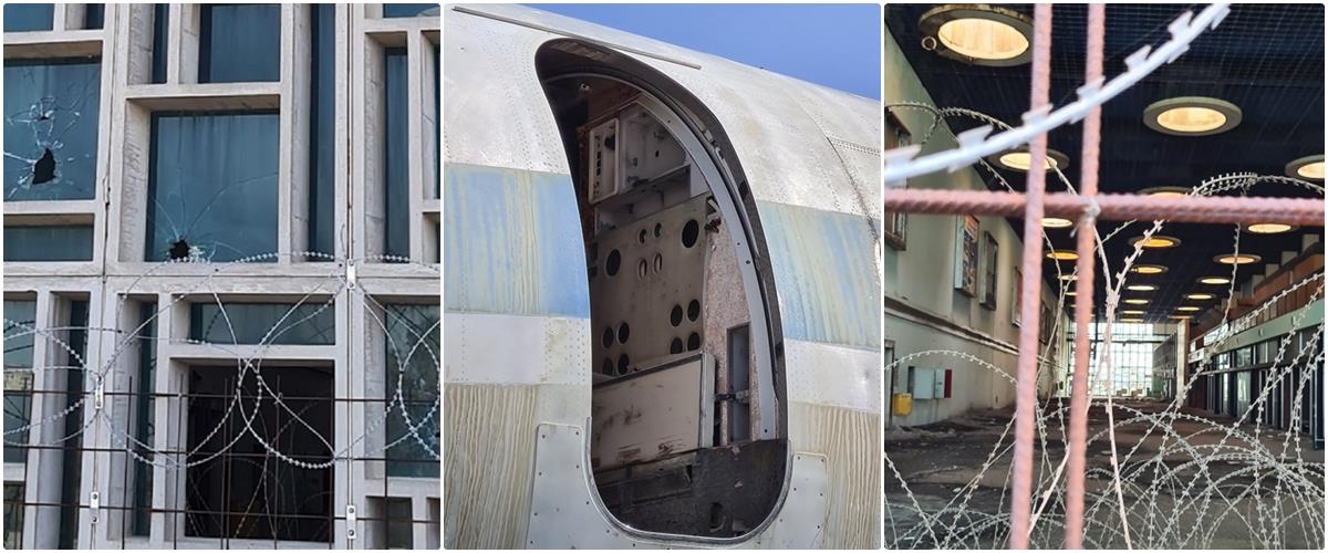 Λίγα μέτρα πιο πέρα από τον Πύργο Ελέγχου, το κεντρικό κτίριο του αεροδρομίου παραδομένο στο χρόνο και γεμάτο λουκέτα παντού. Έτοιμο να καταρρεύσει. Με δύο ράμπες, μία αριστερά και μία δεξιά. Στη μέση, ο κυρίως χώρος, με τα τζάμια γεμάτα σημάδια από σφαίρες μέχρι σήμερα. Ο χαρακτηριστικός γαλάζιος ιμάντας παραλαβής αποσκευών, οι κουζίνες του αεροδρομίου, γραφειακοί χώροι.
