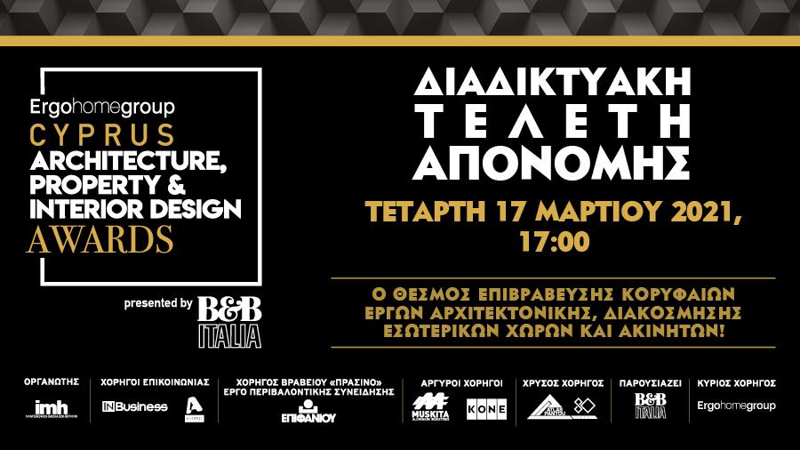 Ο νέος θεσμός «Cyprus Architecture, Property & Interior Design Awards», που πραγματοποιείται για πρώτη φορά στην Κύπρο από την IMH και το περιοδικό IN Business, με τη στήριξη της Ergo Home Group ετοιμάζεται για την ανακοίνωση των νικητών σε μια λαμπρή τελετή. Η τελετή βράβευσης θα πραγματοποιηθεί διαδικτυακά την Τετάρτη 17 Μαρτίου 2021, στις 17:00.