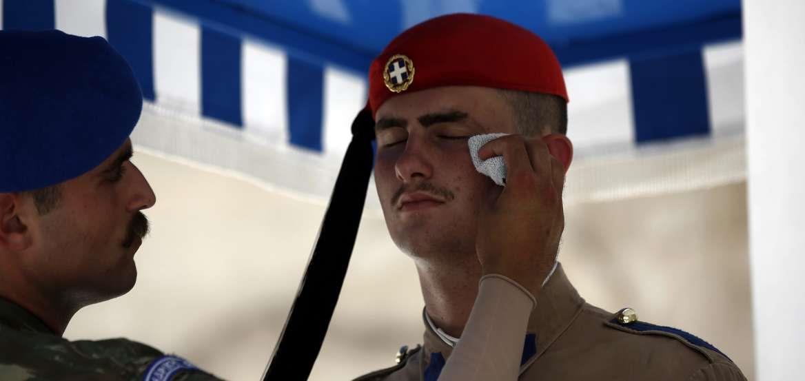 Κάποιοι πίνουν λίγο νερό για να δροσιστούν από τον καύσωνα. Κάποιοι κλείνουν τα μάτια για να τους σκουπίσουν τον ιδρώτα. Και το μόνο σίγουρο είναι ότι οι Εύζωνες - ακόμη και με αυτό τον καιρό - είναι εκεί όρθιοι και οι εικόνες τους κάνουν τον γύρο του Διαδικτύου.