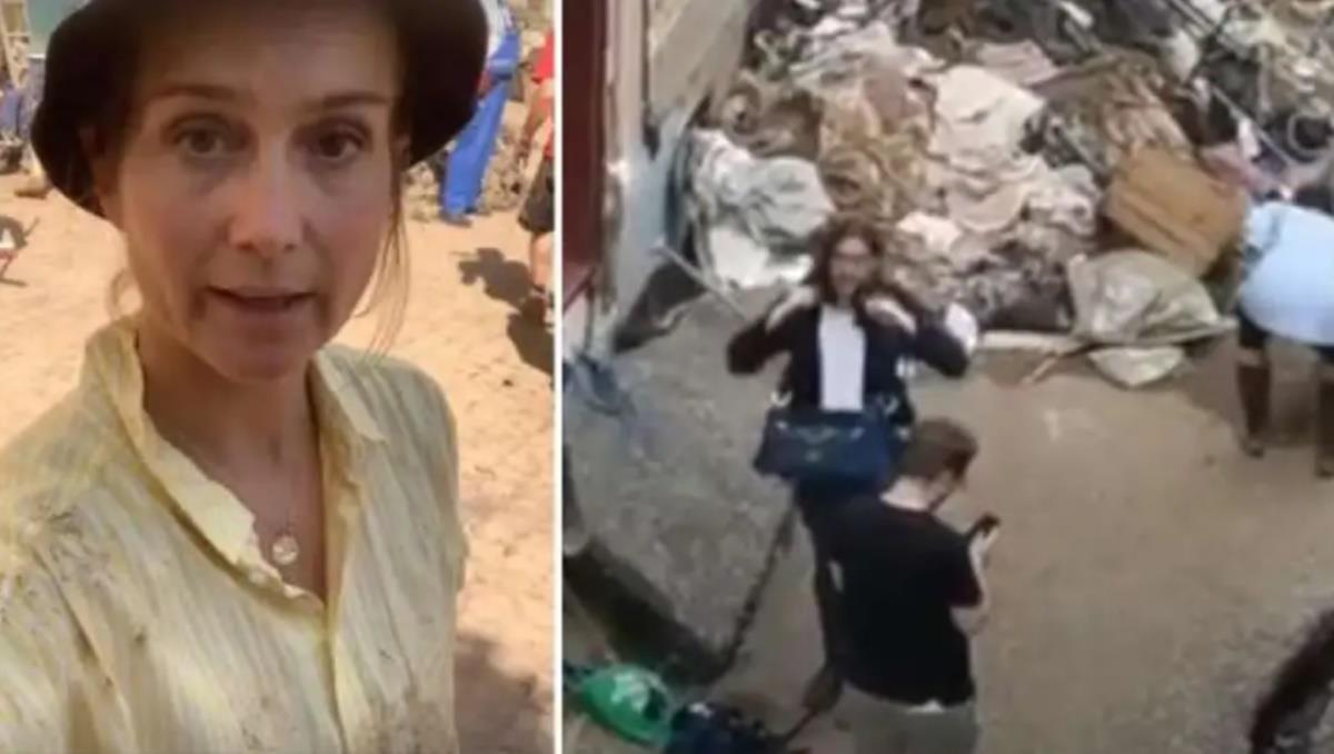 Η Γερμανίδα ρεπόρτερ κρατάει ένα φτυάρι, φοράει μπλε πουκάμισο, γαλότσες, καπέλο και με ειδικά γάντια, φαίνεται ότι συμμετέχει στις προσπάθειες αποκατάστασης της πληγείσας περιοχής. Ωστόσο, για κακή της τύχη, ένας πολίτης κατέγραψε με το κινητό του την ώρα που αλείφεται με λάσπη για να δείξει βρώμικη, και ανέβασε το επίμαχο βίντεο στα social media.