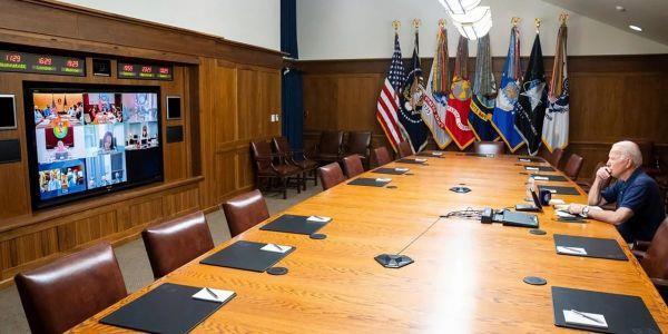 Φωτογραφία που κυκλοφόρησε σήμερα τον δείχνει καθισμένο μόνο μπροστά σε ένα τεράστιο τραπέζι συσκέψεων στο Καμπ Ντέιβιντ απέναντι σε οθόνη τηλεδιάσκεψης στην οποία συμμετέχουν Aμερικανοί αξιωματούχοι.