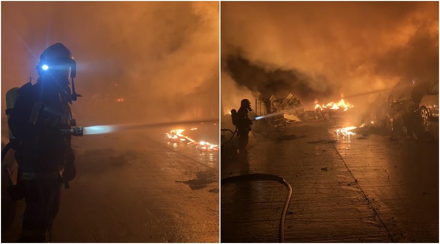 Καίγονται ανακυκλώσιμα υλικά από παλιά οχήματα. Για την κατάσβεση της πυρκαγιάς γίνεται παραγωγή αφρού.
