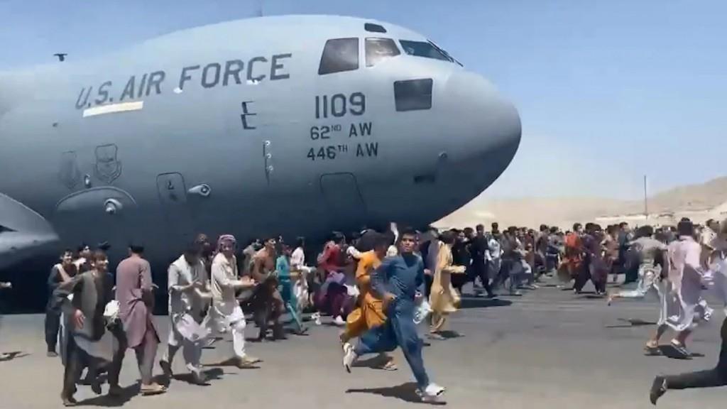 Βίντεο που κυκλοφόρησαν δείχνουν δύο ελικόπτερα Apache να αιωρούνται λίγο πάνω από το έδαφος και να προσπαθούν να απομακρύνουν το πλήθος από τον αεροδιάδρομο. Καθώς οι τέσσερις μεγάλες μηχανές ετοιμάζονταν για την απογείωση, πολλοί άνδρες που κρέμονταν από εκεί έπεσαν κάτω και άρχισαν να τρέχουν δίπλα από το αεροσκάφος.