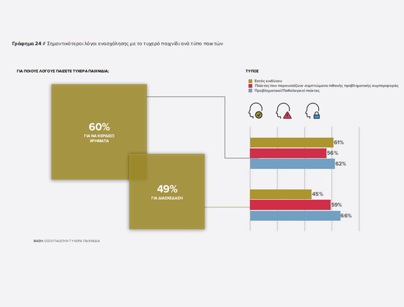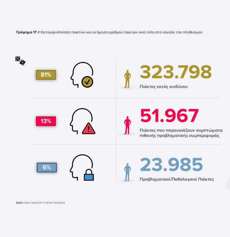 Στην κατηγορία των προβληματικών/παθολογικών παικτών τυχερών παιχνιδιών κατατάσσεται το 6% του συνόλου των παικτών. Μεταφράζοντας τα ευρήματα της έρευνας σε απόλυτους αριθμούς, στη βάση του συνολικού πληθυσμού αναφοράς της, εκτιμάται ότι περίπου 23.985 Κύπριοι παίκτες τυχερών παιχνιδιών ηλικίας 15 ετών και άνω παρουσιάζουν προβληματική/παθολογική συμπεριφορά.