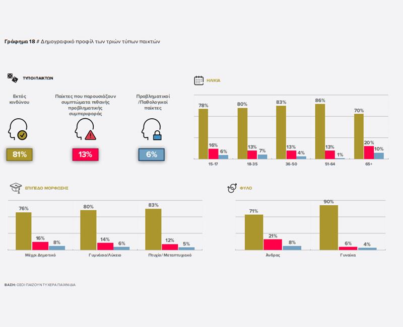 Όσον αφορά το ηλικιακό προφίλ των προβληματικών/παθολογικών παικτών, το υψηλότερο ποσοστό εντοπίζεται ανάμεσα στους παίκτες ηλικίας 65 ετών και άνω, εκ των οποίων το 10% εμπίπτει στον συγκεκριμένο τύπο παικτών.