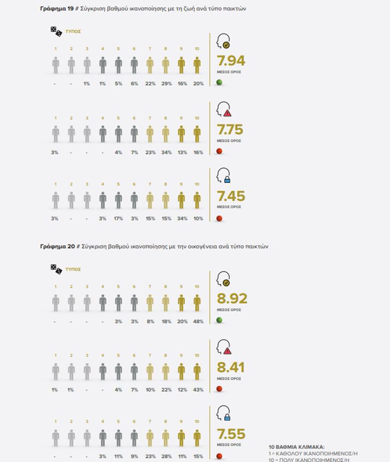 Ειδικότερα, μικρότερη ικανοποίηση με την οικογένειά τους εκφράζουν οι προβληματικοί παίκτες, αξιολογώντας κατά μέσο όρο τη συγκεκριμένη παράμετρο με 7,55 στα 10. Δεδομένου ότι ο θεσμός της οικογένειας αποτελεί ισχυρό συνεκτικό δεσμό της κυπριακής κοινωνίας και τυγχάνει ακόμα και στη σύγχρονη εποχή ύψιστου σεβασμού, η φαινομενικά «λίαν καλή» αξιολόγηση των οικογενειακών σχέσεων με 7,55 κατά μέσο όρο στη δεκαβάθμια κλίμακα, είναι μάλλον μέτρια για τα κυπριακά δεδομένα, κάτι που διαφαίνεται στην ευκολία με την οποία οι συμμετέχοντες στην έρευνα στέφουν με δεκάρια την ικανοποίησή τους από την οικογένειά τους.