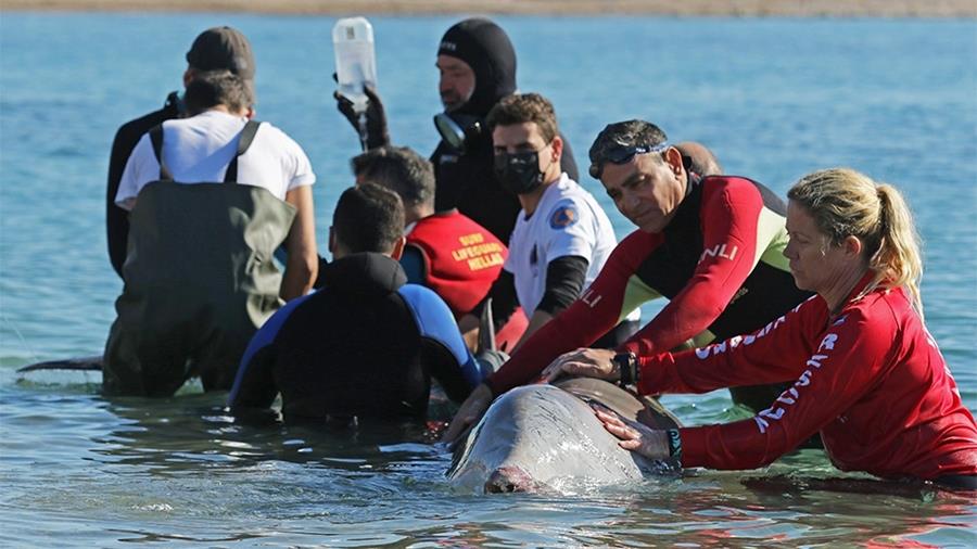 Στο σημείο όπου είχε εγκλωβιστεί το θαλάσσιο θηλαστικό είχαν σπεύσει από νωρίς χθες το πρωί στελέχη του ερευνητικού κέντρου διάσωσης και περίθαλψης κητώδων, στελέχη της Λιμενικής Αρχής Φλοίσβου, περιπολικό σκάφος του Λιμενικού, Εθελοντική Ομάδα Διάσωσης με ιδιώτες δύτες καθώς και κτηνίατρος.