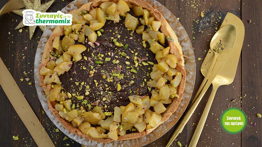 Προτού σερβίρετε, διακοσμήστε περιμετρικά την τάρτα με τα αχλάδια και τα χοντροαλεσμένα φιστίκια Αιγίνης.
