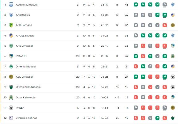 Από την άλλη, ο ΑΠΟΕΛ έπεσε στην 3η θέση με 36 βαθμούς, στην ίδια θέση όπου βρίσκεται και η ΑΕΚ με τους ίδιους βαθμούς, ωστόσο ο σύλλογος της Λευκωσίας υπερτερεί στη βαθμολογία.
