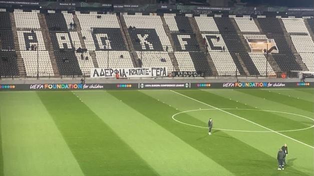 Οι οργανωμένοι λοιπόν οπαδοί του ΠΑΟΚ, αποφάσισαν να σηκώσουν ένα νέο… εμετικό πανό στη ρεβάνς των «ασπρόμαυρων» με την Μίντιλάντ στην Τούμπα στο οποίο αναγράφεται χαρακτηριστικά: «Αδέρφια κρατάτε γερά».