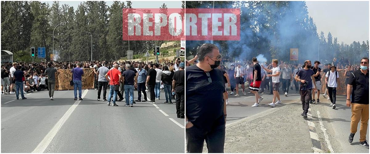 Στο σημείο βρέθηκαν εκατοντάδες μαθητές, κρατώντας πανό, φωνάζοντας συνθήματα και ανάβοντας φωτοβολίδες. Σημειώνεται ότι, στο σημείο βρίσκονται και μέλη της Αστυνομίας.