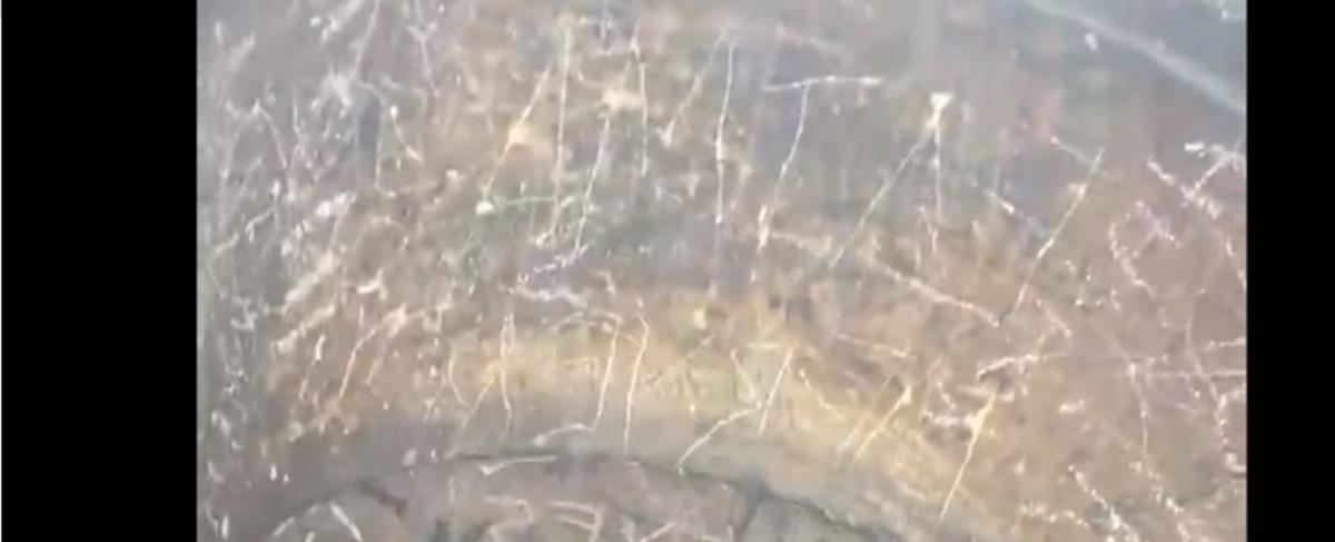 Το βίντεο δείχνει ότι στη στήλη στήριξης φαίνονται graffiti με ονόματα, σχήματα που έχουν χαραχτεί με αιχμηρό αντικείμενο, σε εσωτερικό χώρο.