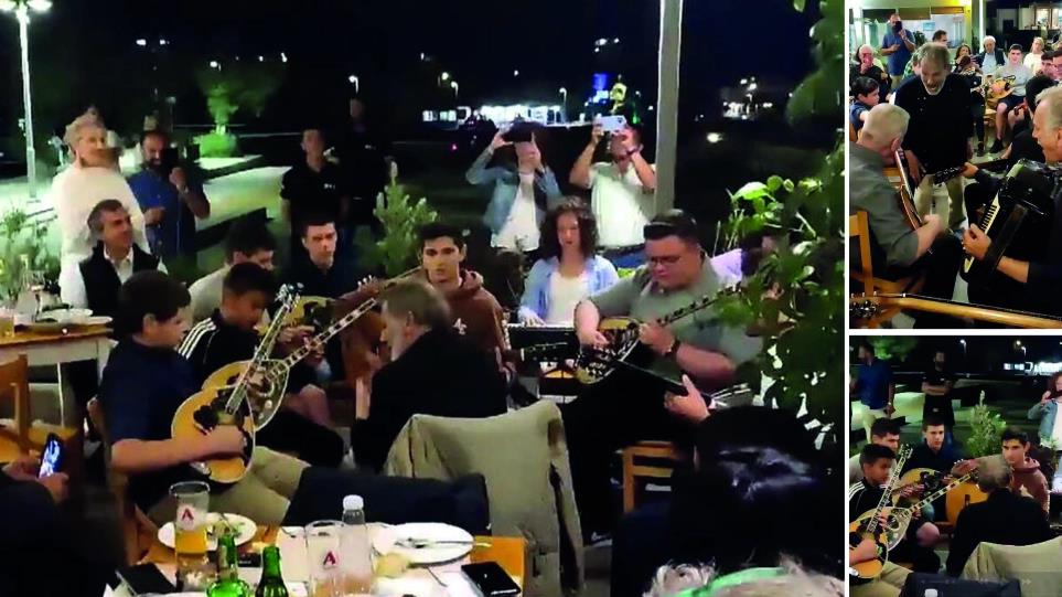 Ο Έλληνας συνθέτης με το ίδιο πάθος που θα καθοδηγούσε μία κανονική ορχήστρα διευθύνει τα παιδιά να παίξουν τη Φραγκοσυριανή.