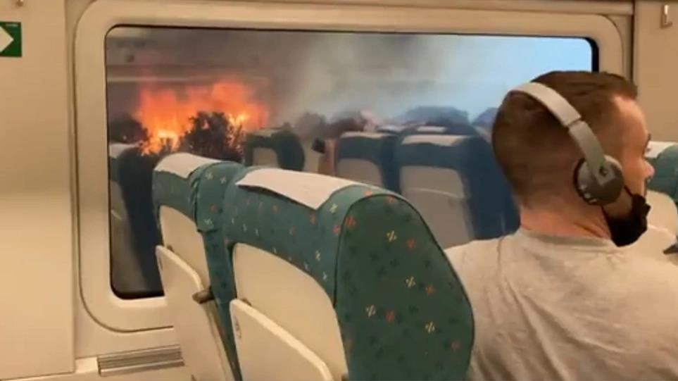 Το περιστατικό τρόμου εκτυλίχθηκε στη δυτική Ισπανία, ενώ τη στιγμή που καίει η φωτιά οι επιβάτες παρακολουθούν έντρομοι από τη θέση τους την πορεία του πύρινου μετώπου. Για καλή τους τύχη, κανείς δεν τραυματίστηκε και το μέσο μεταφοράς κατάφερε να συνεχίσει την πορεία του.