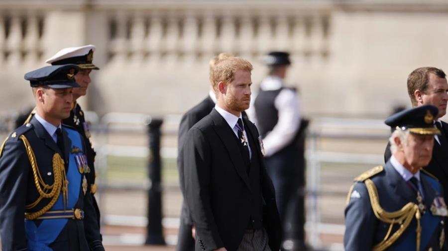 Ο πρίγκιπας Άντριου και ο πρίγκιπας Χάρι κοίταζαν επίμονα στο πάτωμα καθώς τους απαγορεύτηκε να χαιρετίσουν το φέρετρο της βασίλισσας Ελισάβετ σήμερα κατά τη διάρκεια της πομπής - ενώ άλλα μέλη της βασιλικής οικογένειας, όπως ο βασιλιάς Κάρολος Γ', ο πρίγκιπας Ουίλιαμ και η πριγκίπισσα Άννα, έκαναν τη χειρονομία.
