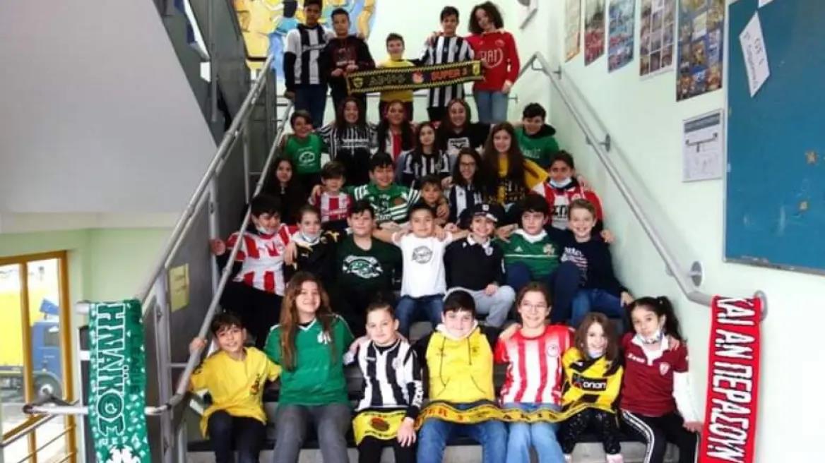 Συγκεκριμένα μαθητές και καθηγητές μαζί φωτογραφήθηκαν με τις φανέλες των αγαπημένων τους ομάδων για να στηρίξουν τις δράσεις της δομής «Εις το όνομα του Άλκη».
