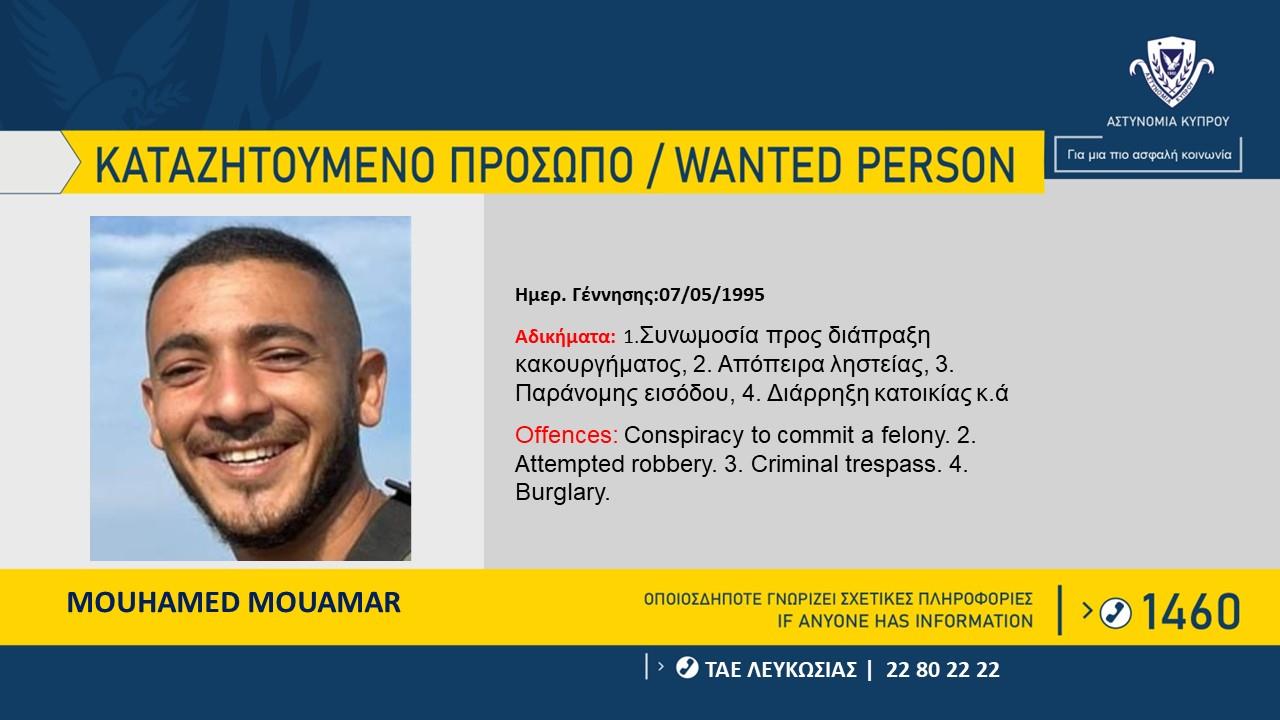 Η Αστυνομία ζητεί πληροφορίες για τον εντοπισμό του MOUHAMED MOUAMAR, 28 ετών από τη Συρία, για διευκόλυνση των ανακρίσεων, σχετικά με διερευνώμενη υπόθεση συνωμοσίας προς διάπραξης κακουργήματος, απόπειρας ληστείας, παράνομης εισόδου, διάρρηξη κατοικίας κ.ά, τα οποία διαπράχθηκαν στις 31/08/2023 στην επαρχία Λευκωσίας.