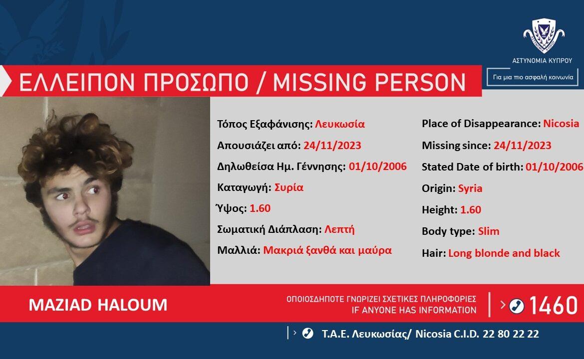 Πρόκειται για τον Maziad Haloum, ημερομηνία γέννησης 01/10/2006, από Συρία, ο οποίος ελλείπει από τον χώρο διαμονής του, από το πρωί της Παρασκευής, 24 Νοεμβρίου, 2023.