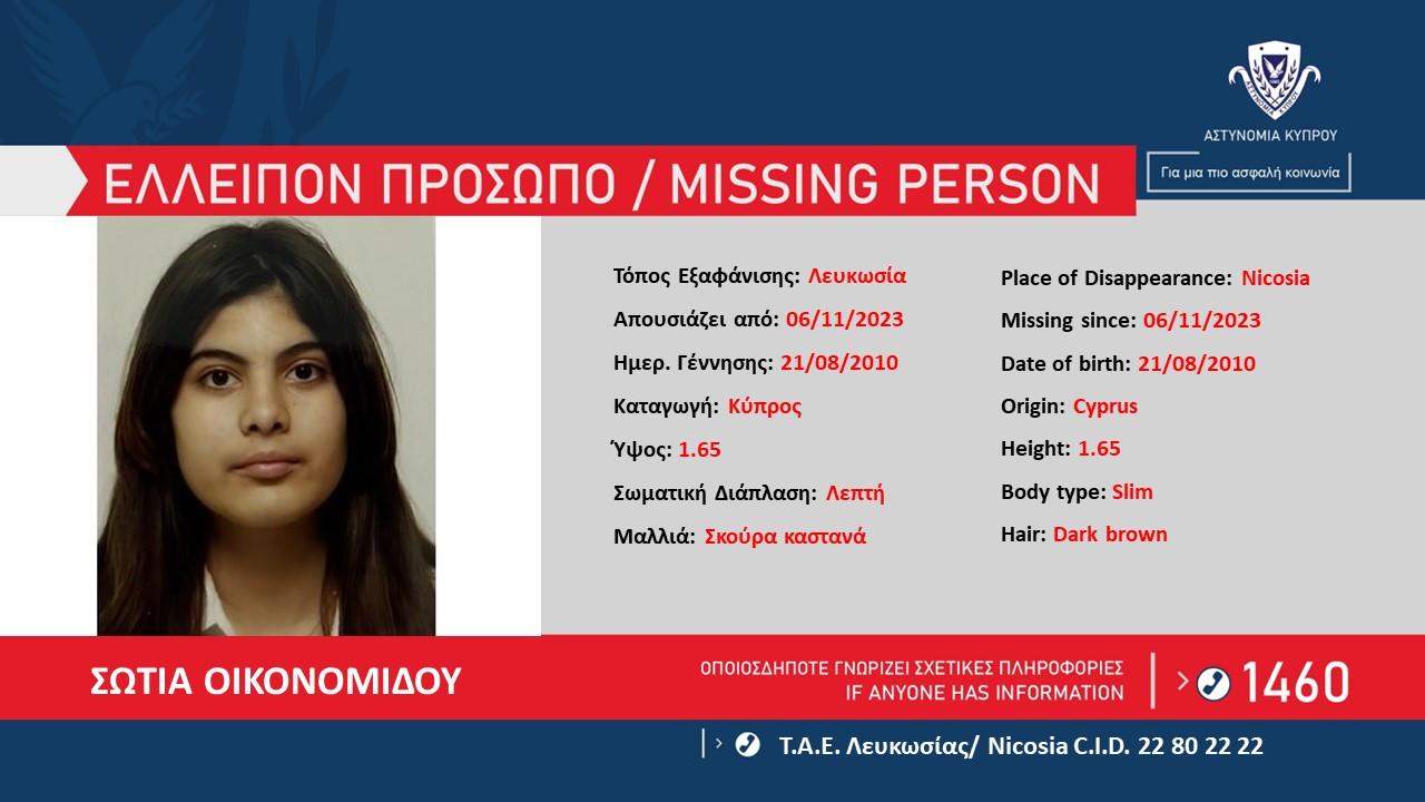 Πρόκειται για την Σώτια Οικονομίδου, ημερομηνία γέννησης 21/08/2010, η οποία ελλείπει από τον χώρο διαμονής της, από τις 9.00 το βράδυ της Δευτέρας, 06 Νοεμβρίου, 2023. Αυτή περιγράφεται ως λεπτής σωματικής διάπλασης, ύψους 1.65μ. περίπου, με σκούρα καστανά μαλλιά, ενώ κατά την τελευταία φορά που θεάθηκε, φορούσε πράσινη φανέλα της ποδοσφαιρικής ομάδας του Σωματείου «Ομόνοια», μαύρο παντελόνι τύπου κολάν, και άσπρα παπούτσια.