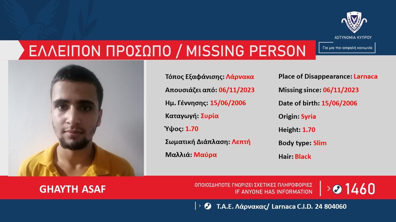 Η Αστυνομία ζητά πληροφορίες που μπορούν να βοηθήσουν στον εντοπισμό του Ghayth Asaf, 17 ετών, από τη Συρία, ο οποίος απουσιάζει από το χώρο διαμονής του στη Λάρνακα, από το απόγευμα της 6 ης Νοεμβρίου 2023.