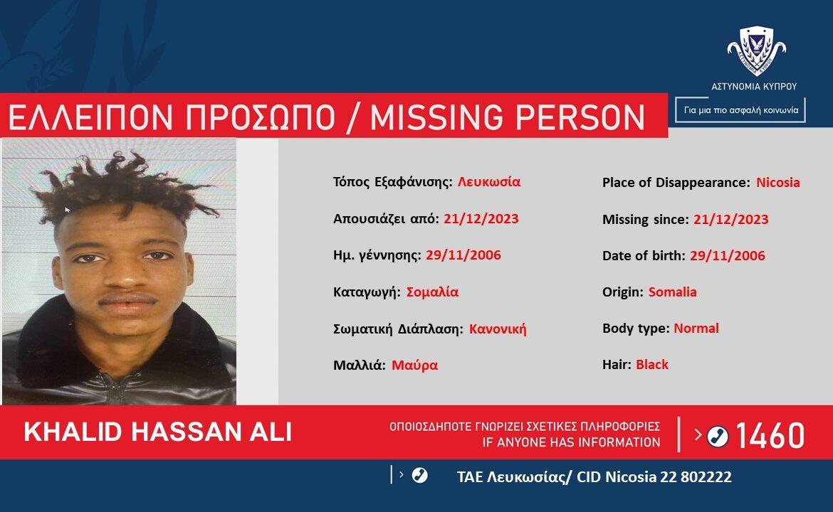 Η Αστυνομία ζητά πληροφορίες για εντοπισμό του KHALID HASSAN ALI, 17 ετών από τη Σομαλία, ο οποίος απουσιάζει από τον χώρο διαμονής του στη Λευκωσία από χθες 21/12/2023.
