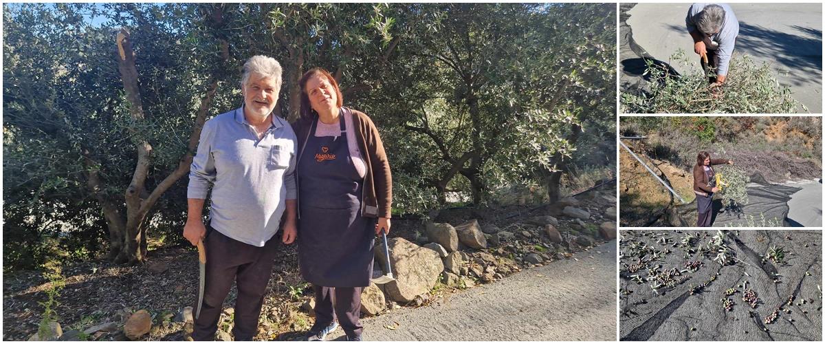 Με τη μέθοδο της χτενιάς, δηλαδή της πλαστικής τσουγκράνας, και των δικτύων, μαζεύουν τις ελιές τους η Μυρούλα και ο Μόδεστος Ξενοφώντος, οι οποίοι είναι από τους νεαρότερους κατοίκους που συνεχίζουν να διαμένουν στο χωριό Φτερικούδι. Μοιράστηκαν μαζί μας τη διαδικασία της συγκομιδής του καρπού, εξηγώντας την καθαρά χειρωνακτική μέθοδο που ακολουθούν για να μπορέσουν να μαζέψουν τις ελιές που φροντίζουν ολόχρονα.