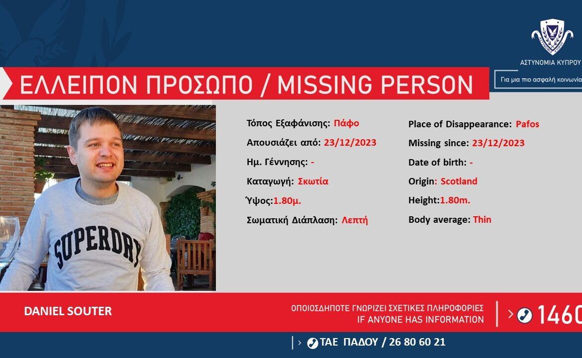Η Αστυνομία ζητά πληροφορίες που μπορούν να βοηθήσουν στον εντοπισμό του DANIEL SOUTER 29 ετών, από την Σκωτία, ο οποίος απουσιάζει από τις 23 Δεκεμβρίου 2023, από το ξενοδοχείο όπου διαμένει στην Πάφο.