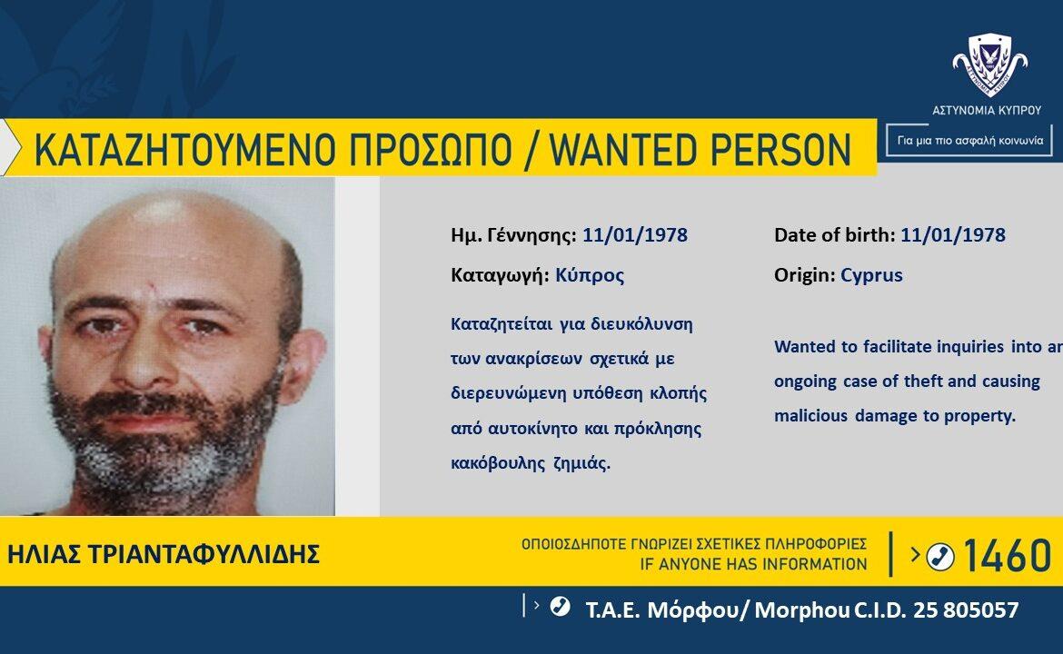 Η Αστυνομία ζητά πληροφορίες που μπορούν να βοηθήσουν στον εντοπισμό του Ηλία Τριανταφυλλίδη, 45 ετών, εναντίον του οποίου εκκρεμεί δικαστικό ένταλμα σύλληψης για διευκόλυνση των ανακρίσεων σχετικά με διερευνώμενη υπόθεση κλοπής από όχημα και πρόκλησης κακόβουλης ζημιάς, που διαπράχθηκε στην επαρχία Λευκωσίας, στις 26 Νοεμβρίου 2023.