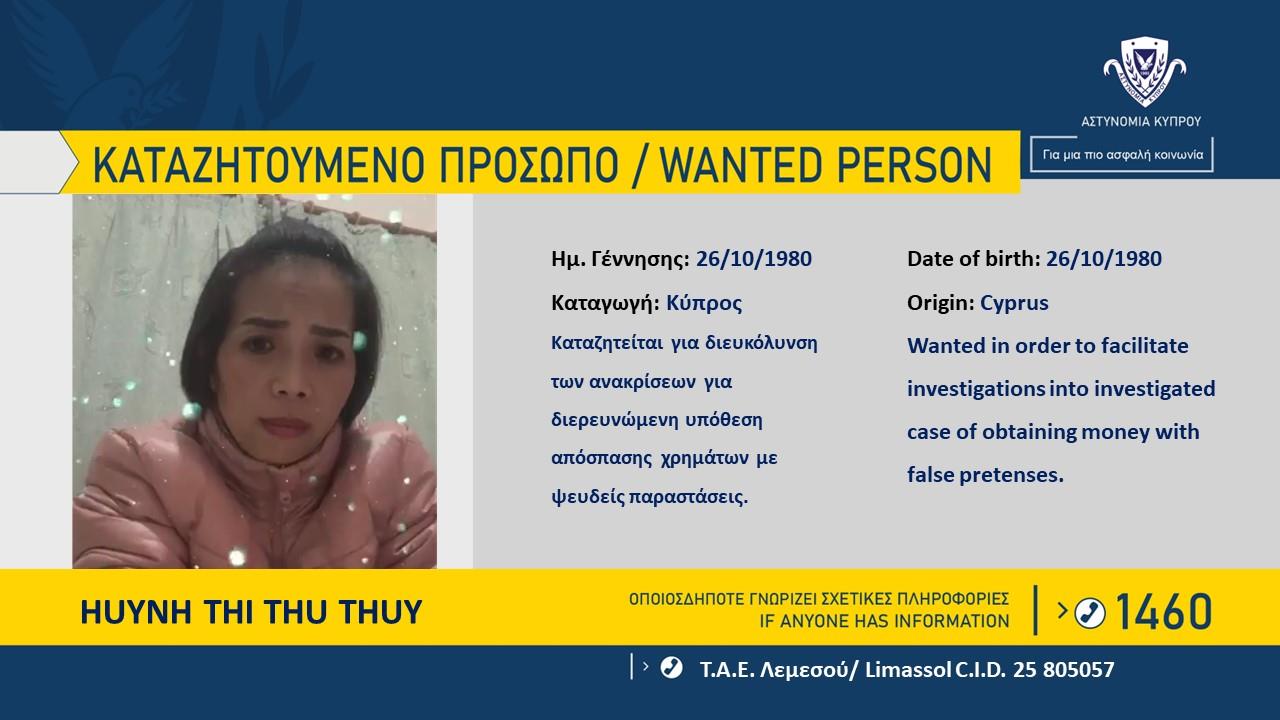Η Αστυνομία ζητά πληροφορίες που μπορούν να βοηθήσουν στον εντοπισμό της HUYNH THI THU THUY, 42 ετών, από το Βιετνάμ, εναντίον της οποίας εκκρεμεί δικαστικό ένταλμα σύλληψης, για διευκόλυνση των ανακρίσεων σχετικά με υπόθεση απόσπασης χρημάτων με ψευδείς παραστάσεις.